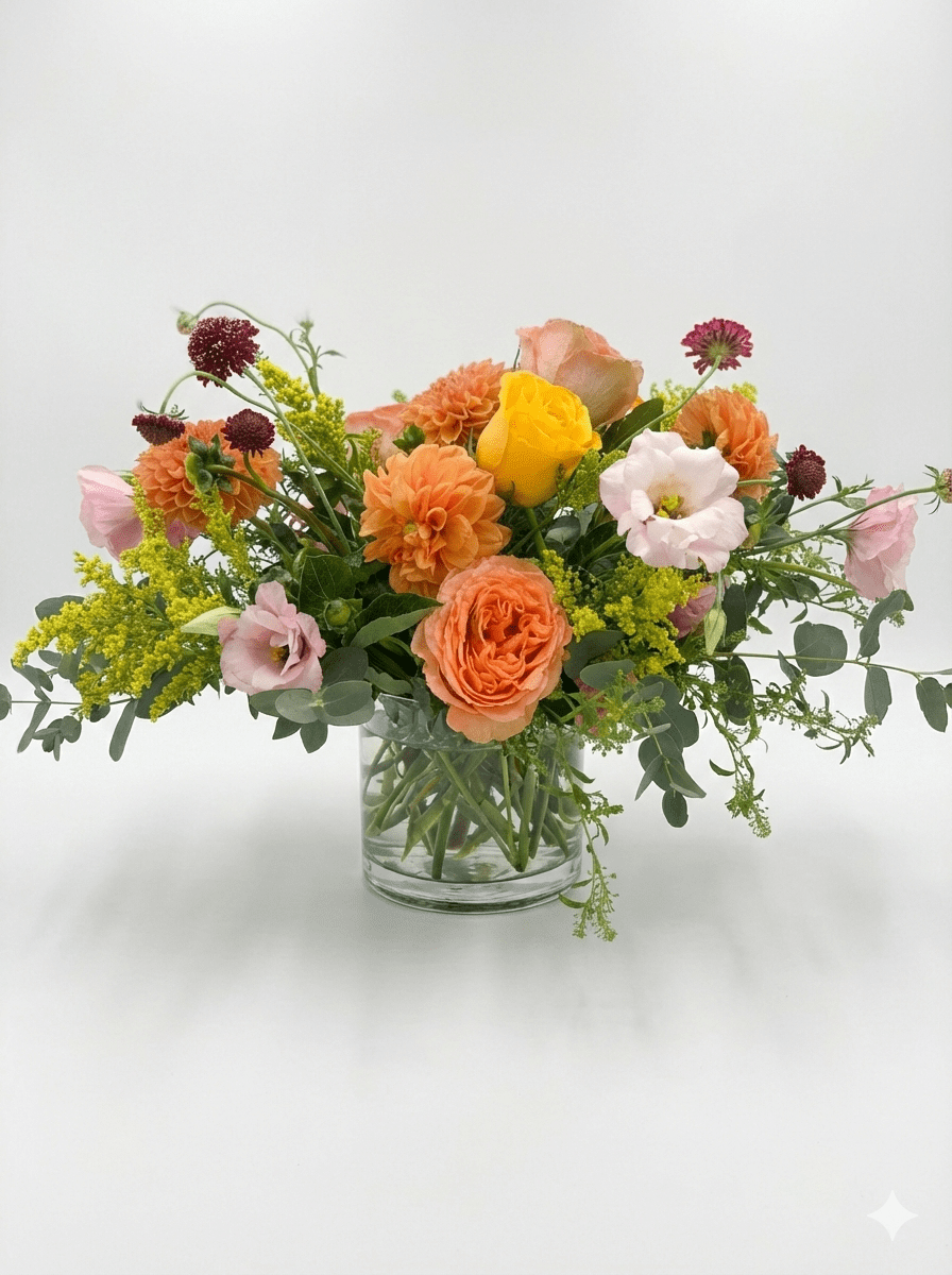 A sunset-inspired mix of orange roses, peach dahlias, pink lisianthus, maroon scabiosa, solidago and seasonal foliage. A relaxed garden bouquet full of California charm!